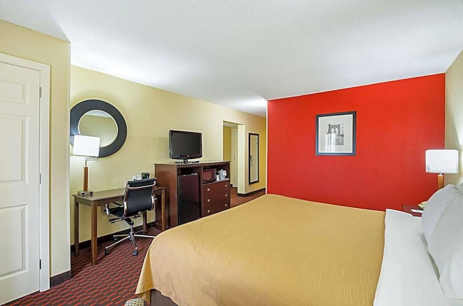 This room has a flat-screen TV, microwave, refrigerator, and coffee maker.